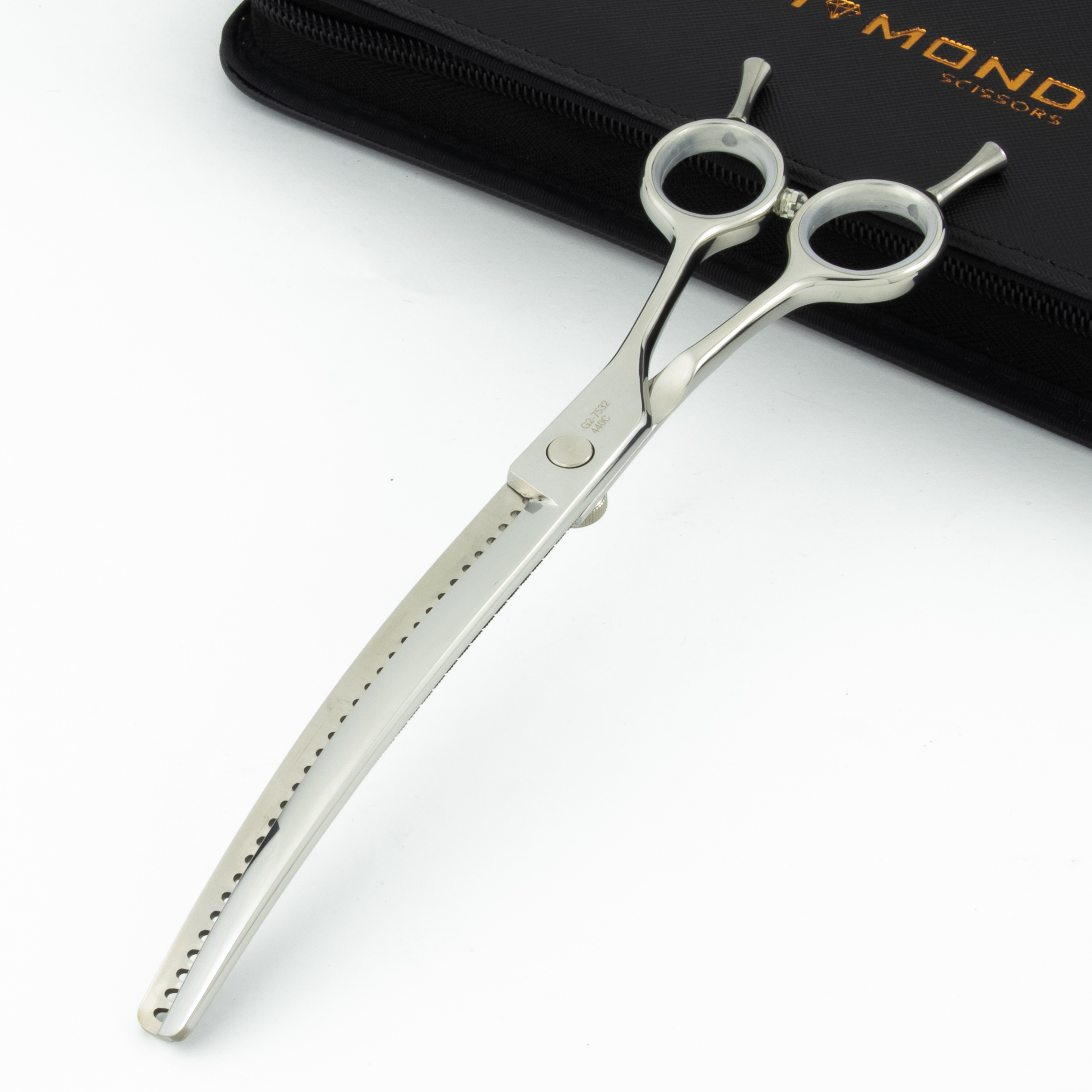 Made of hardened Japanese stainless steel 440C. The curvature is upward. They feature two finger rests that can be detached and a decorative screw for scissor adjustment.