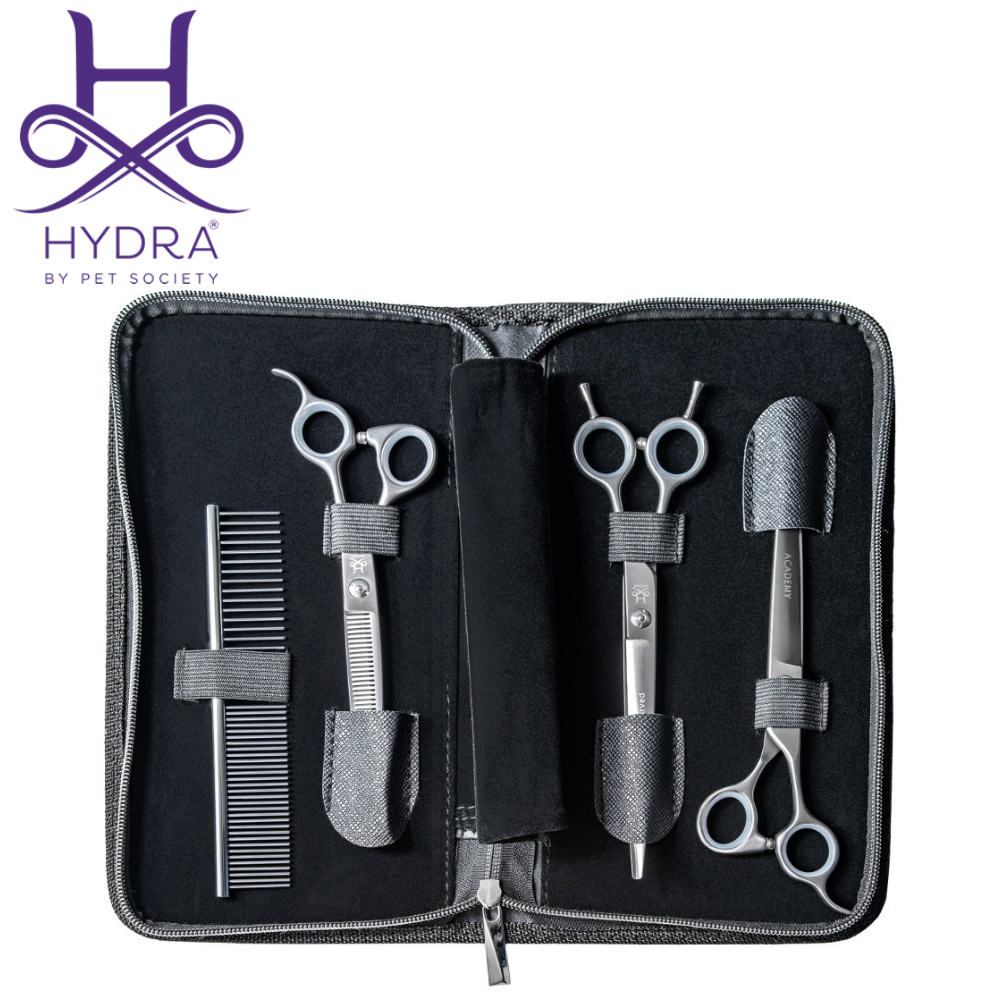 The ACADEMY SET is a set of three scissors and a comb at an affordable price, designed for beginners or aspiring hairstylists.