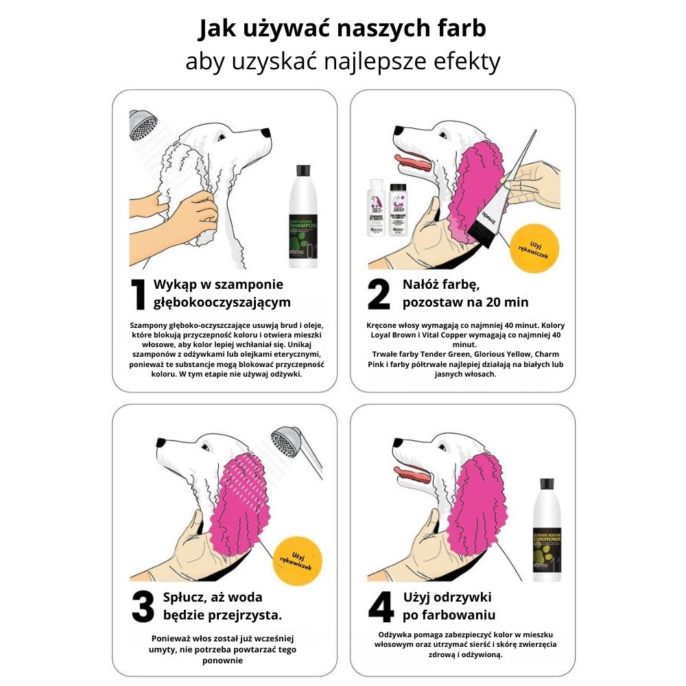 • If any allergic reactions happen during dyeing, discontinue process immediately and consult a veterinarian. Allergy test on the skin is recommended 48 hours prior to application if the pet is being colored for the first time.